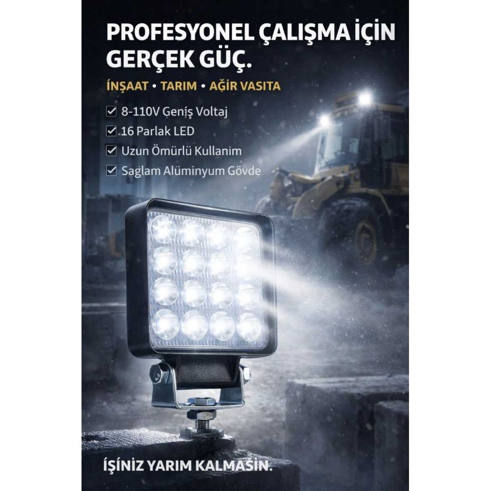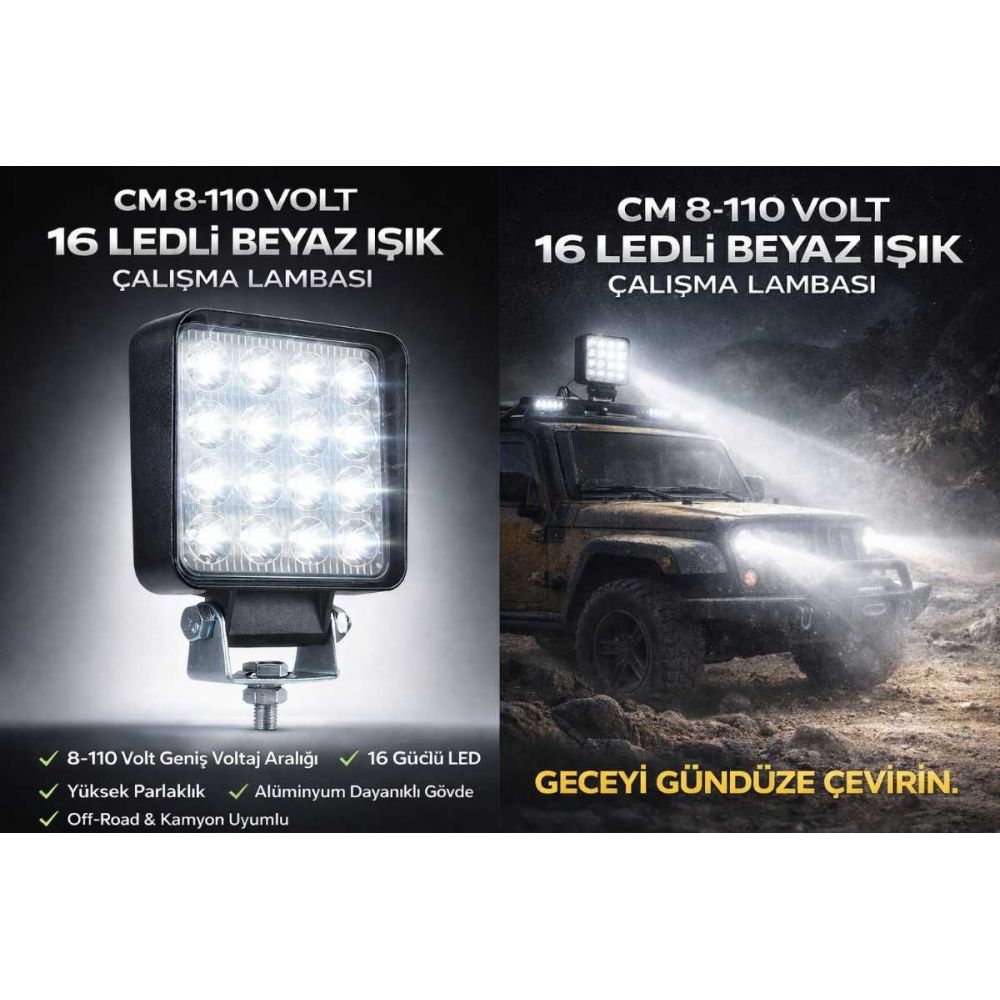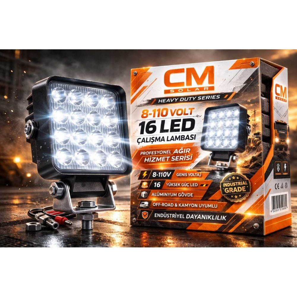 Zorlu saha koşulları için tasarlanan CM 8-110V 16 LED Çalışma Lambası, yüksek ışık gücü ve geniş voltaj desteği sayesinde ağır vasıta ve off-road araçlar için maksimum performans sunar.